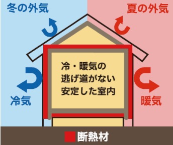 断熱方法には、家全体を外側から断熱材で包む外張り断熱工法を採用しています。