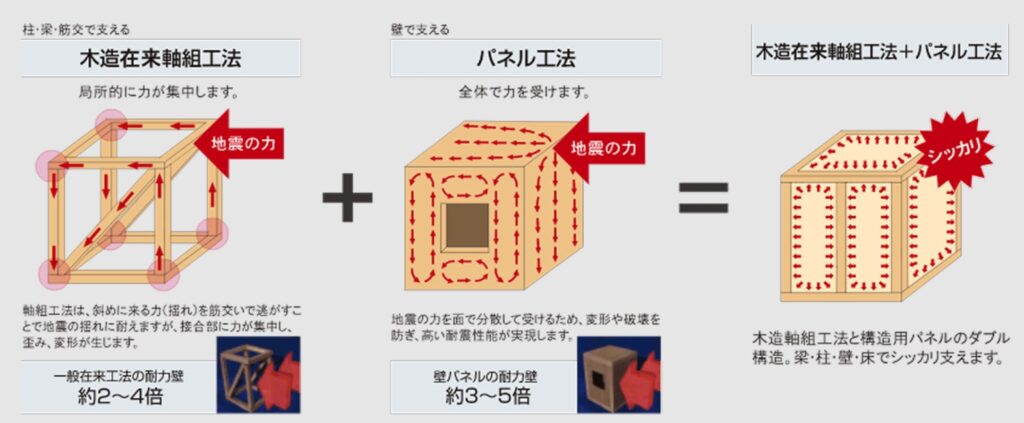 FIXは、木造軸組工法にパネル工法と特殊金物を組み合わせた構造を採用しています。