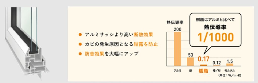 樹脂はアルミに比べて熱伝導率が約1,000分の1で、断熱・気密性能を大幅に向上させ、結露の発生も抑制します。