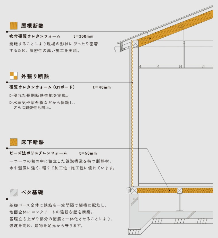 - 外張り断熱:硬質ウレタンフォーム(Q1ボード)t=40mm(長期断熱性能に優れ、水蒸気・紫外線からも保護)